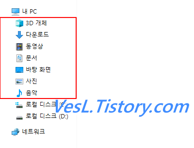 윈도 10을 설치하면 파일 탐색기에서, 내 PC 아래에 불필요한 메뉴가 많이 생긴다.